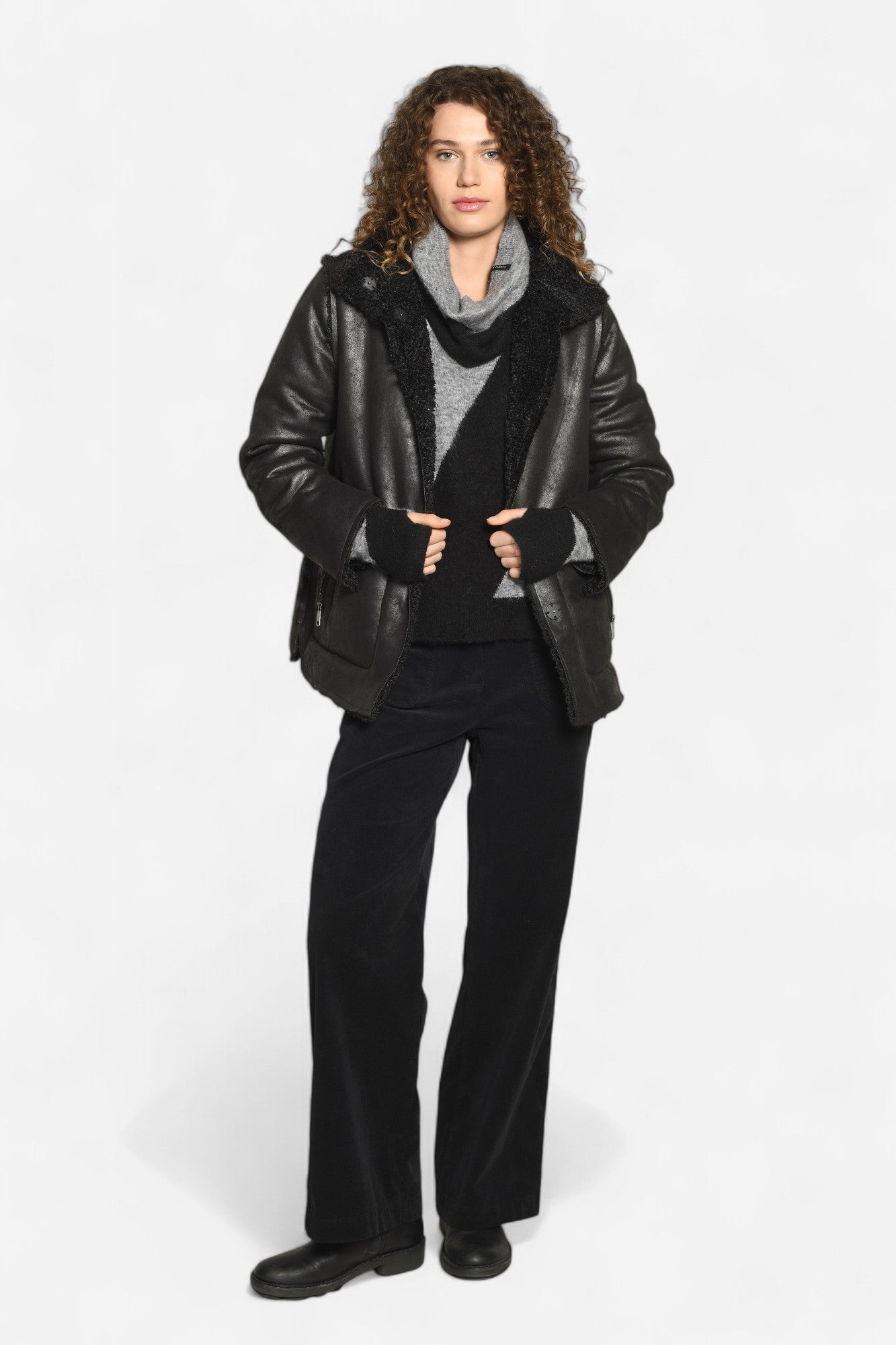 Jas BUNI uit de kleding collectie van AMBER & MOON. Korte reversible jas. De jas kan zowel aan de teddy kant als aan de wax kant gedragen worden.