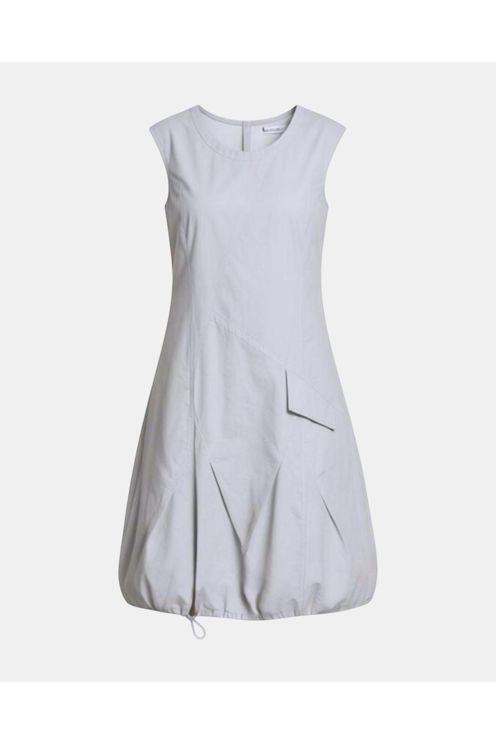 Jurk CELIA uit de kleding collectie van AMBER & MOON. Mouwloze jurk met ronde hals en een grote klepzak. Het bovenlijf loopt recht en het onderste gedeelte is ballonvormig met een split en aantrekkoordje in de zoom.