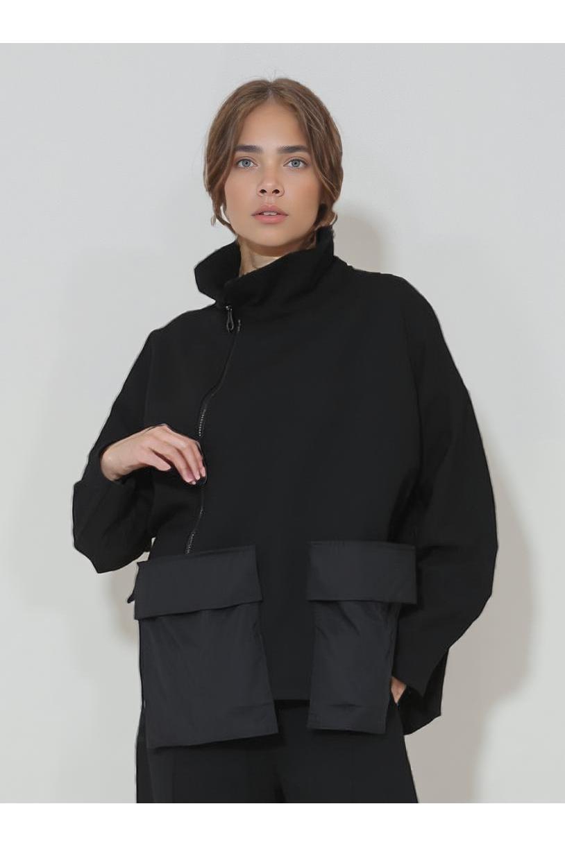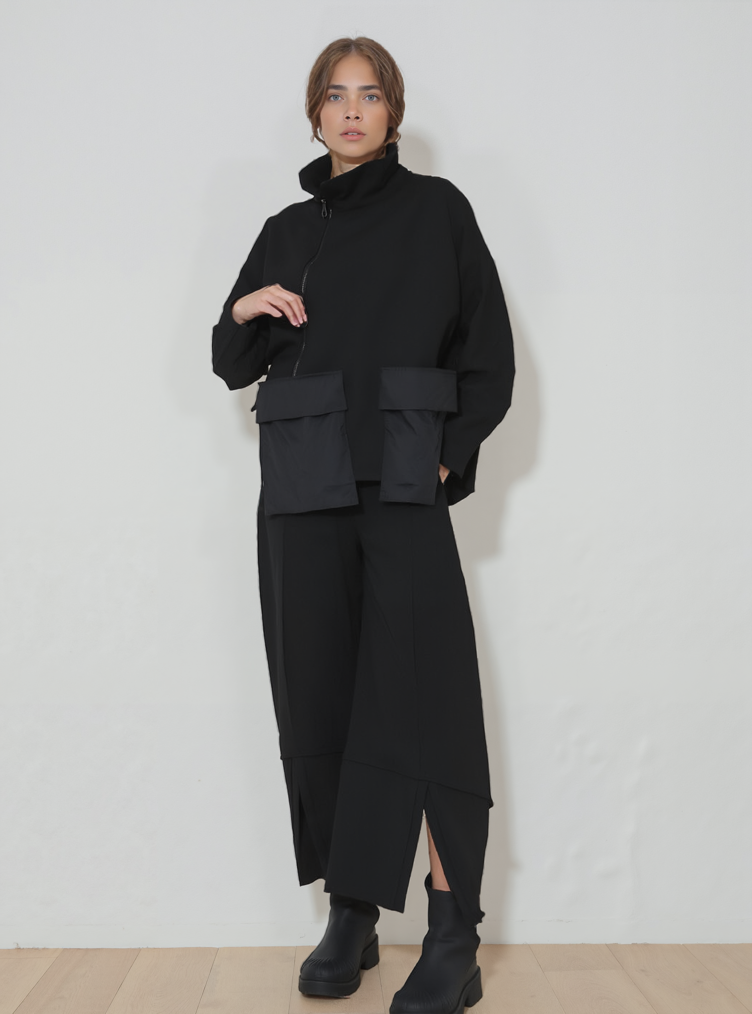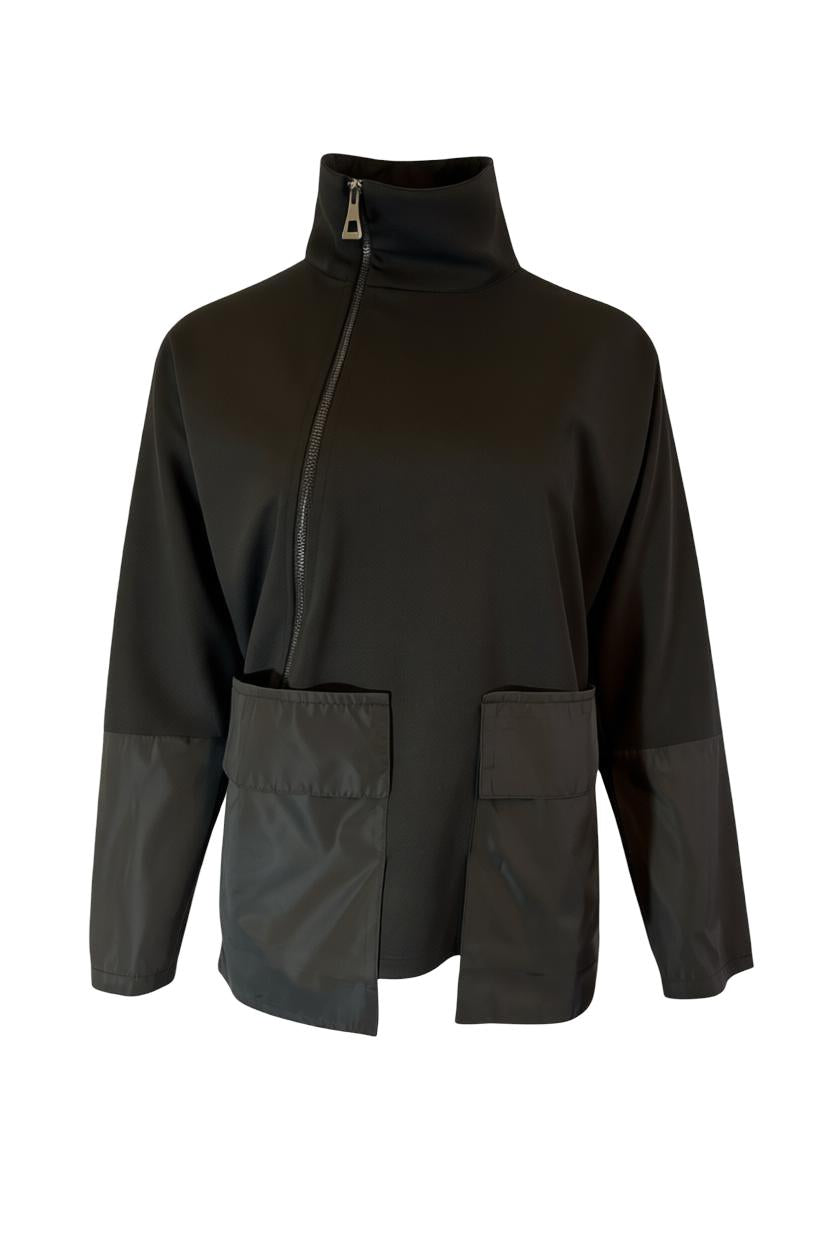 Jasje uit de kleding collectie van NILMARK. Vest jasje met asymmetrische ritssluiting en opstaande colkraag. De zakken vallen langer dan het voorpand. De zak die over de rits valt kun je los maken.
