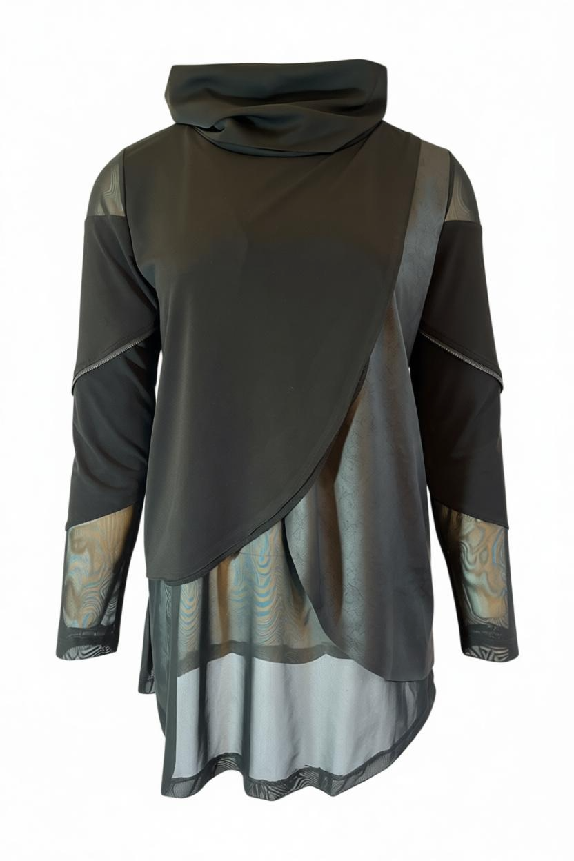 Top ZORA uit de kleding collectie van NILMARK. Een eigenzinnige top gemaakt van verschillende materialen die los over elkaar vallen op het voorpand. De top heeft een losvallende dunne col en rotsdetails op de mouwen.