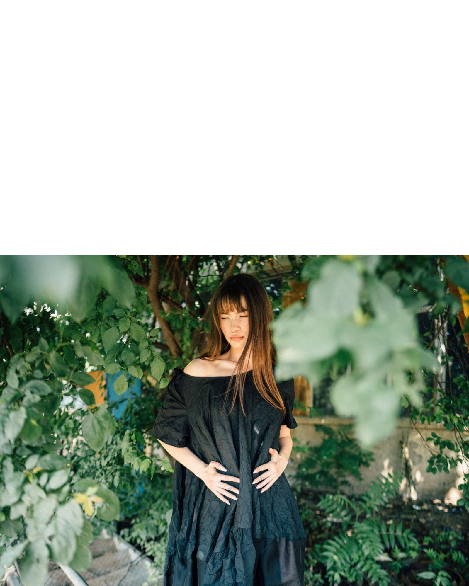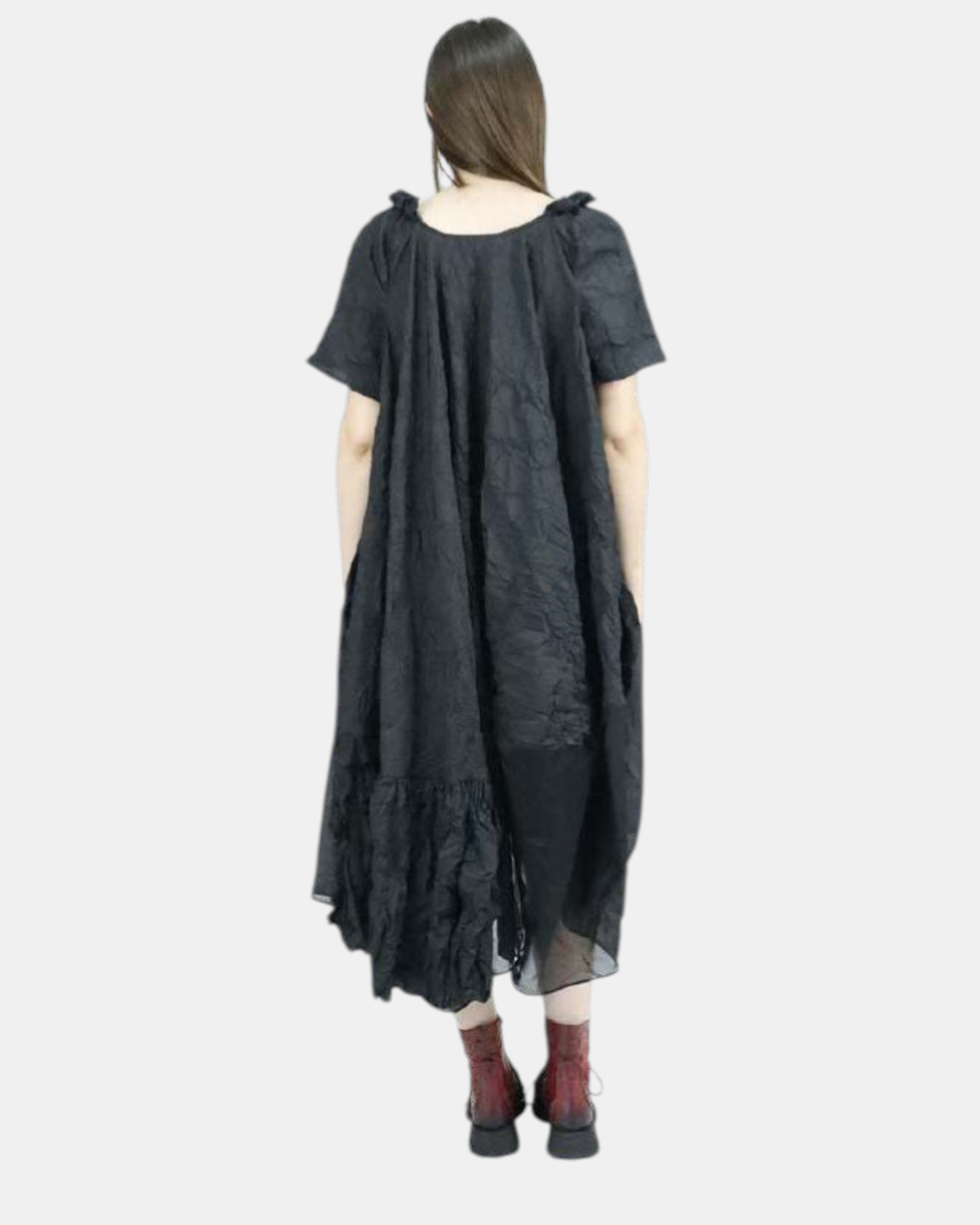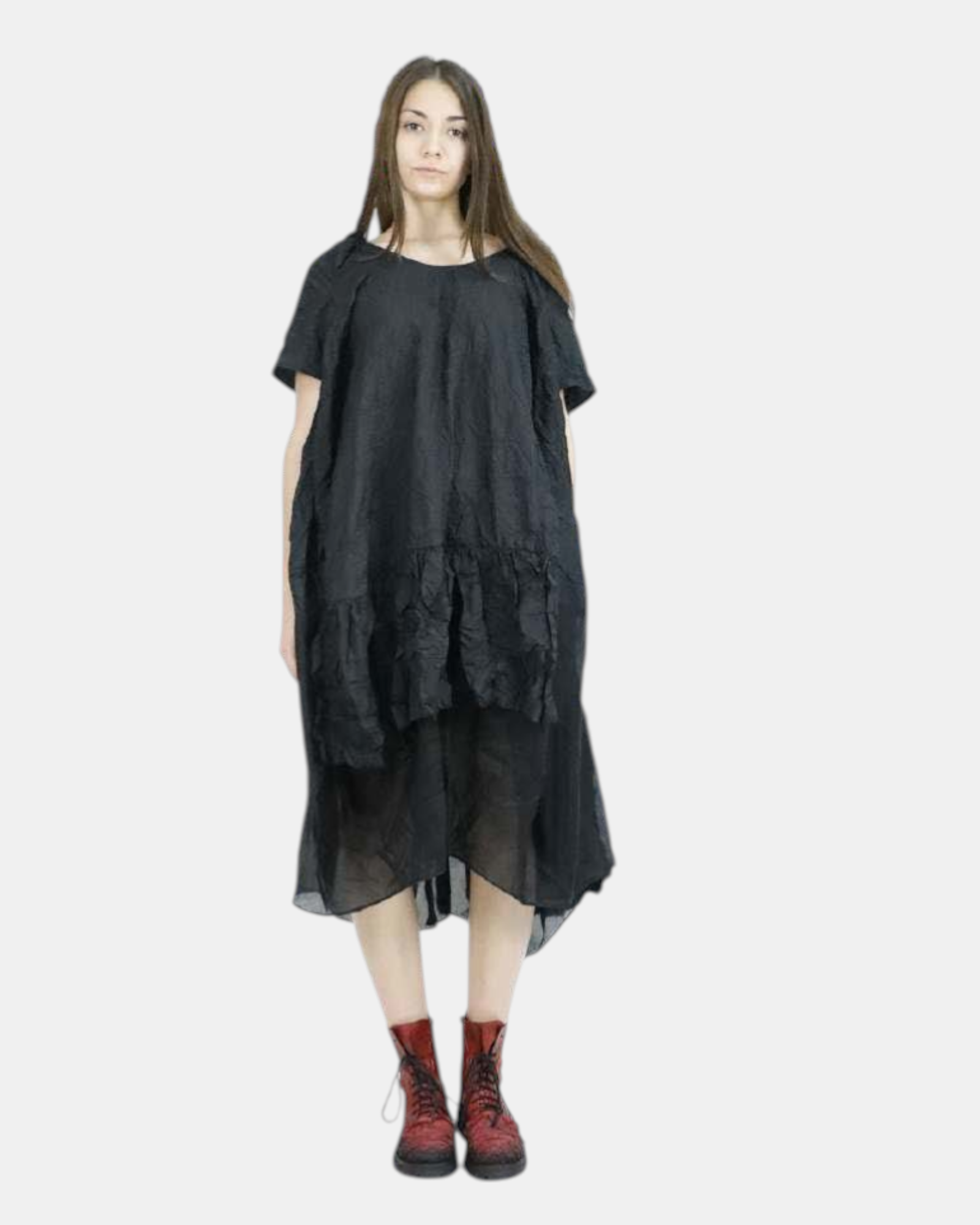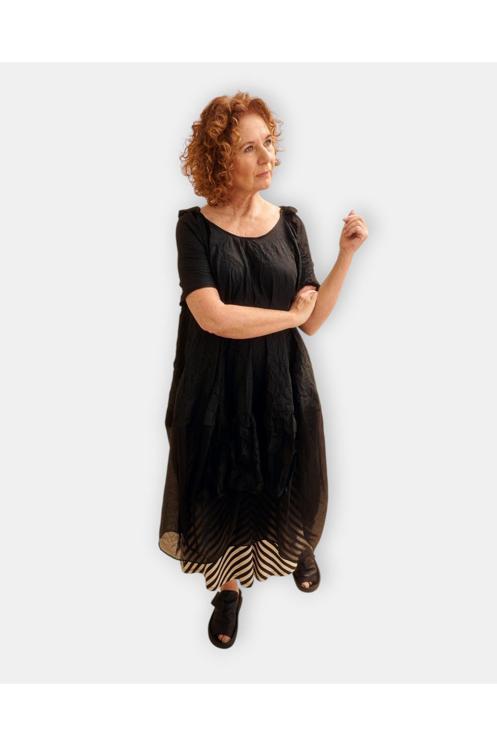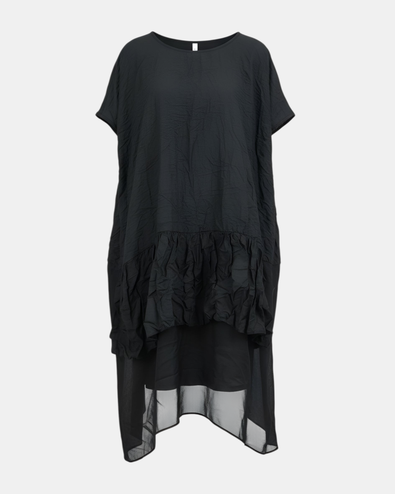 Jurk SAPPHIRE DUSKVALE uit de kleding collectie van PAPUCEI. Tulp model jurk met aan de onderzijde een dubbele laag dunne licht transparante stof. De jurk heeft korte mouwen en in de hals, op de schouder een klein geplooid detail.