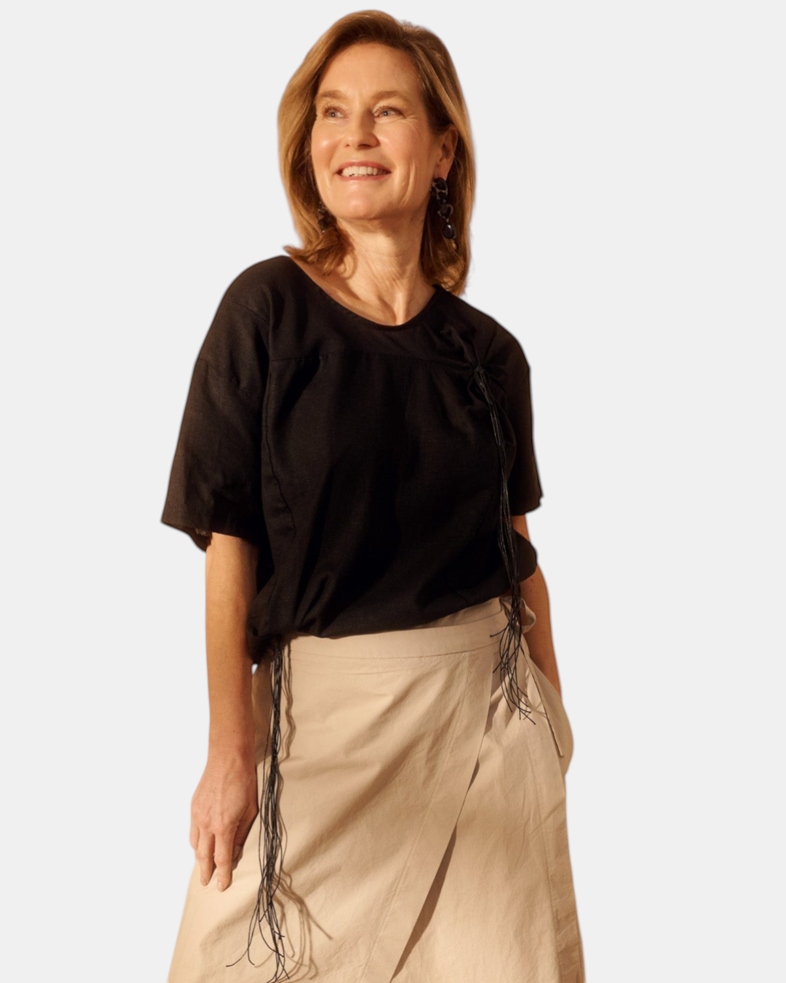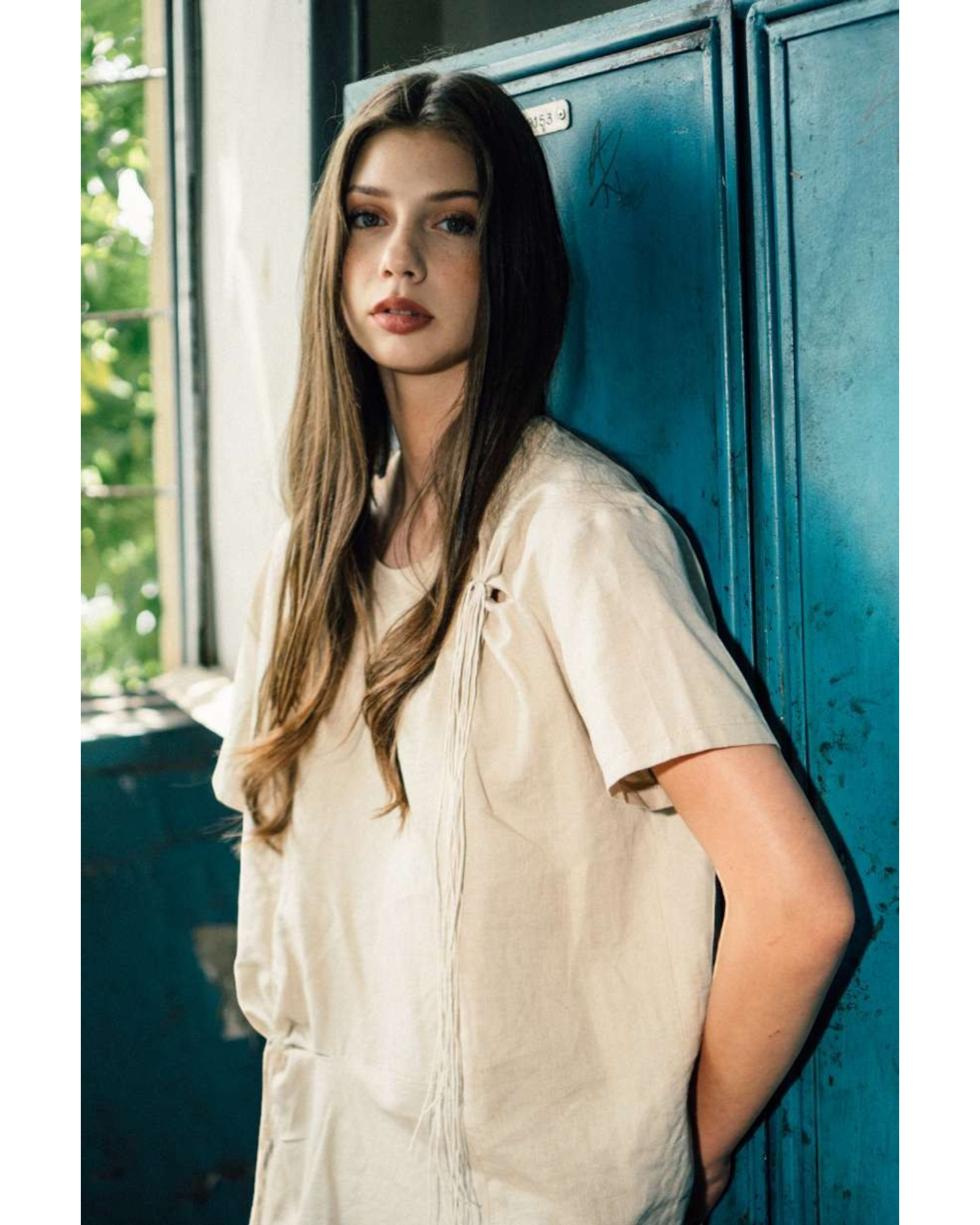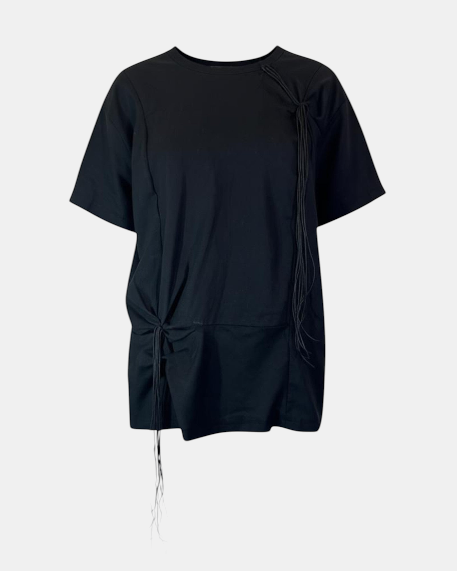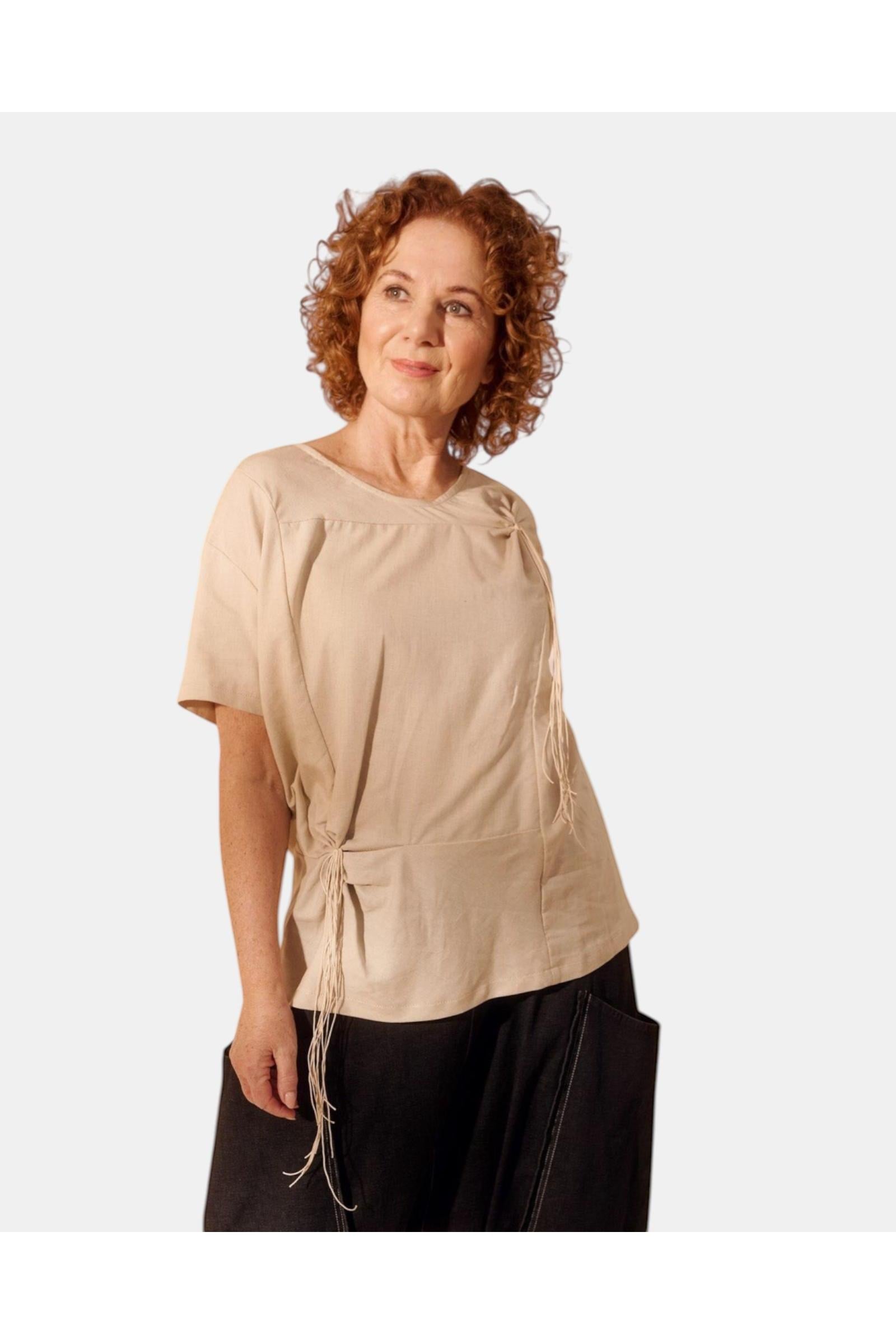 Top BLUSH LUMIERE uit de kleding collectie van PAPUCEI. Recht model met ronde hals en korte mouwen. Op het voorpand heeft de top twee koord details.