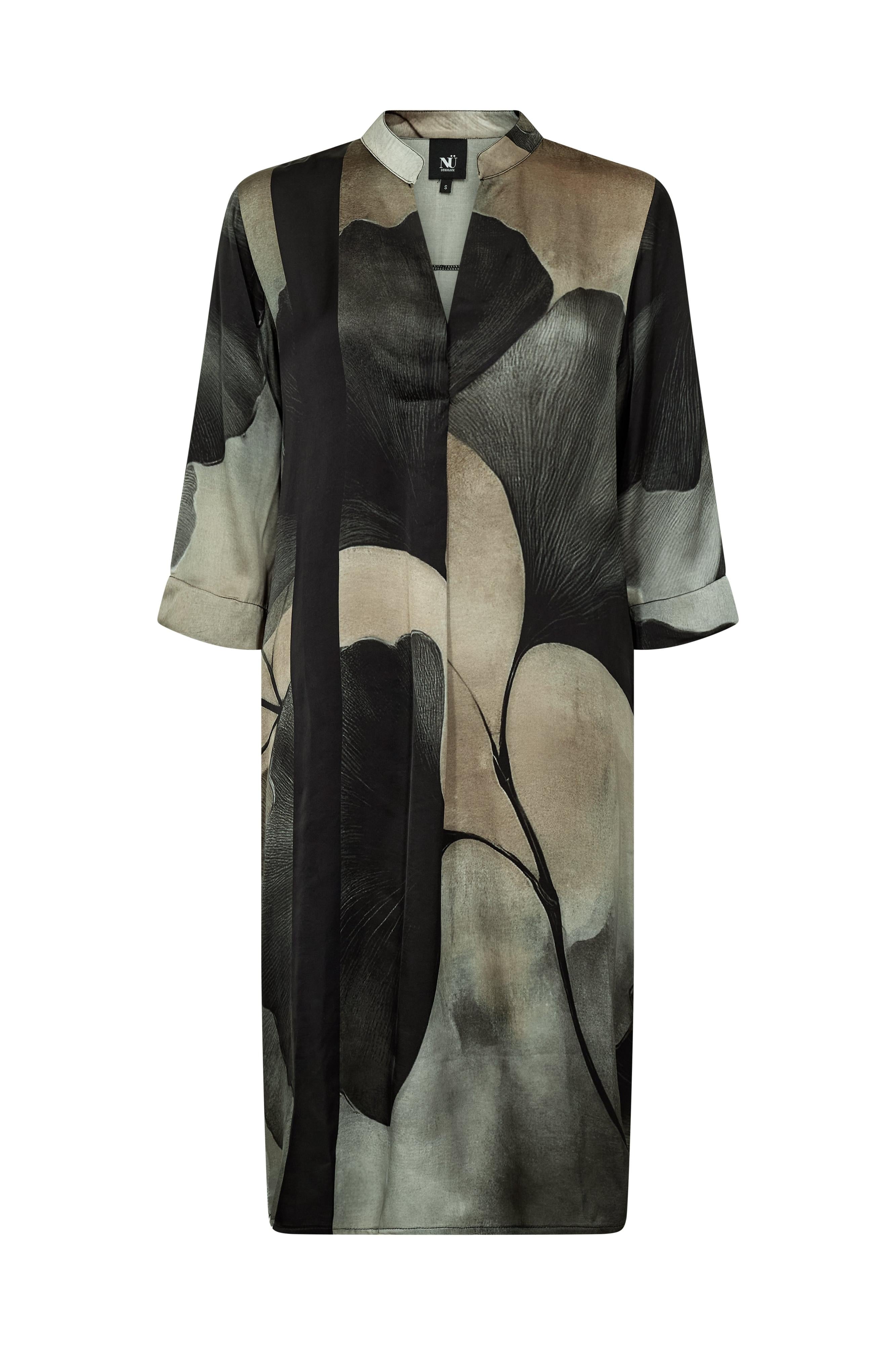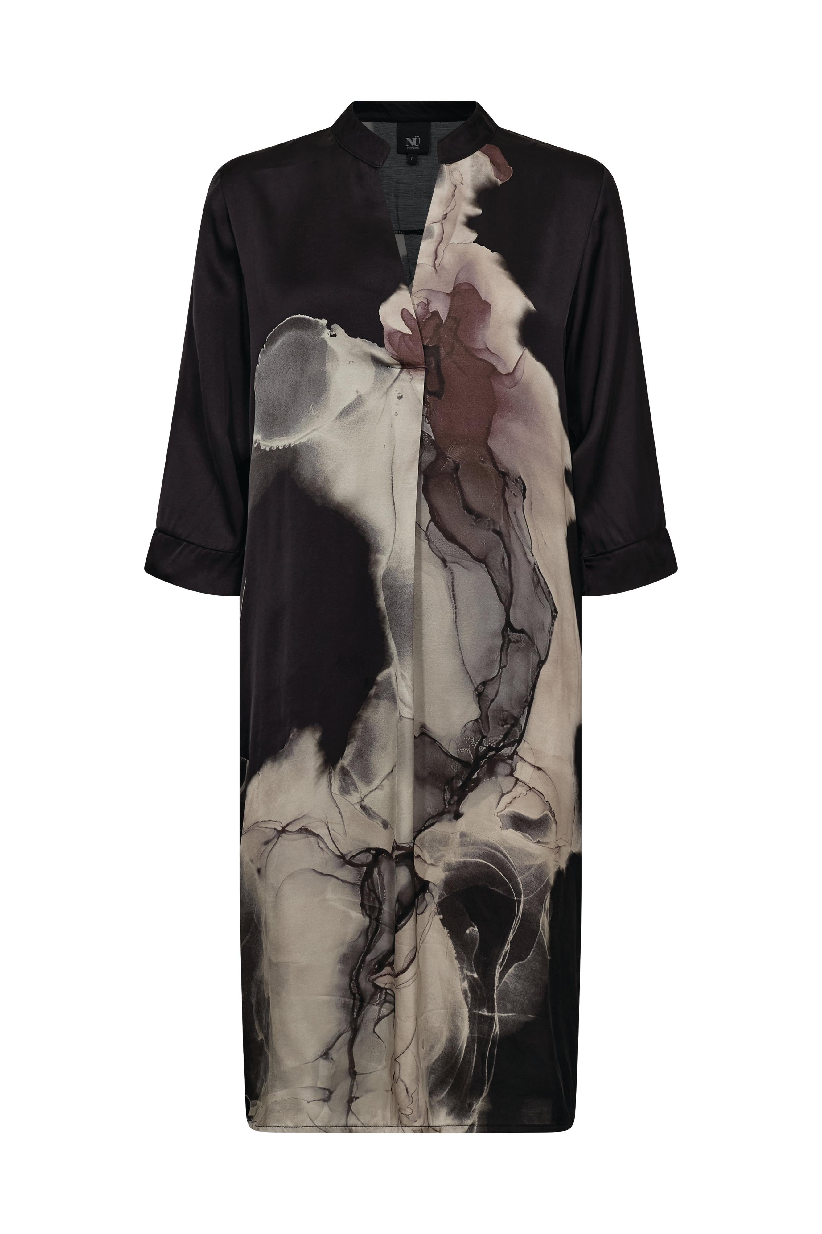 Tuniek jurk CILJE uit de kleding collectie van NÜ DENMARK. Elegante tuniek jurk met een v-hals. De jurk heeft een zwarte ondergrond met grafische print in beige/bruin nuances. De 3/4 mouwen hebben een manchet.
