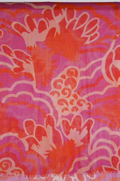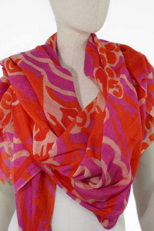 Wollen sjaal van AHMADDY met abstract bloemdessin in rood/roze tinten.