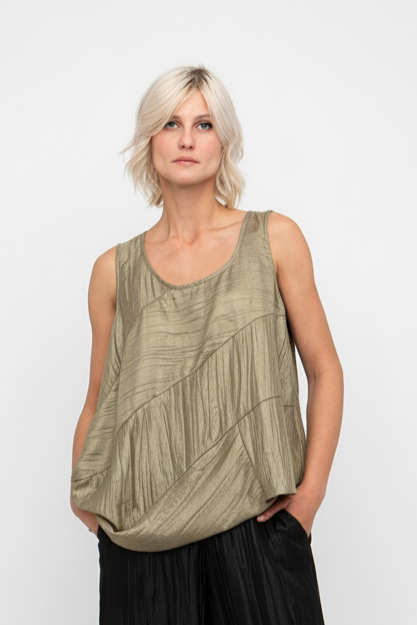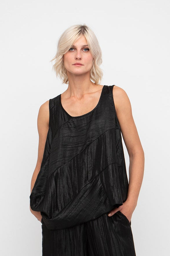 Top ELATE uit de kleding collectie van OZAI N KÜ. Mouwloze top met asymmetrische deelnaden en een ronde hals.