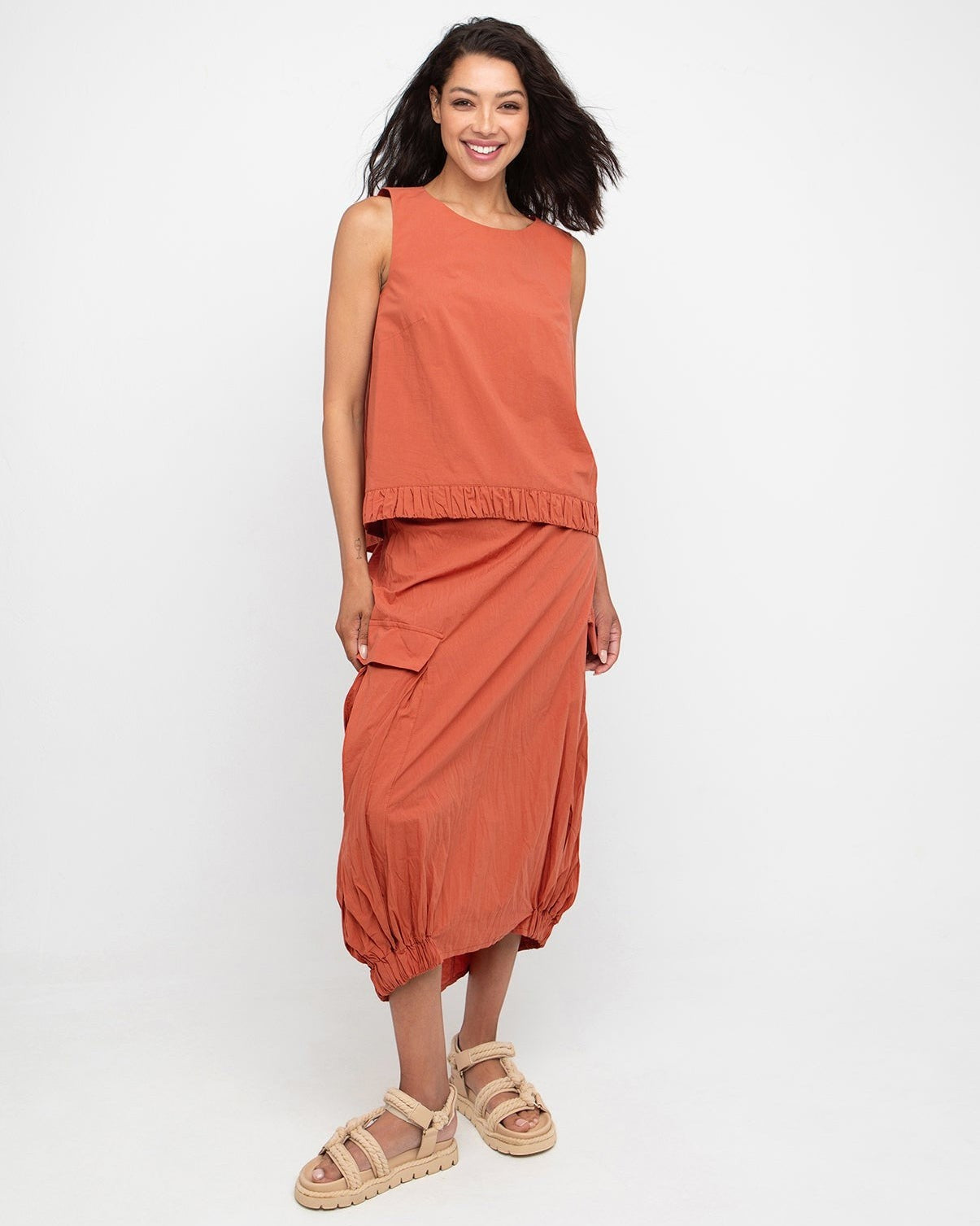 Rock FRIDA aus der Bekleidungskollektion von OZAI N KÜ. Leicht zulaufendes Modell mit teilweise elastischem Saum. Der Rock hat große aufgesetzte Taschen