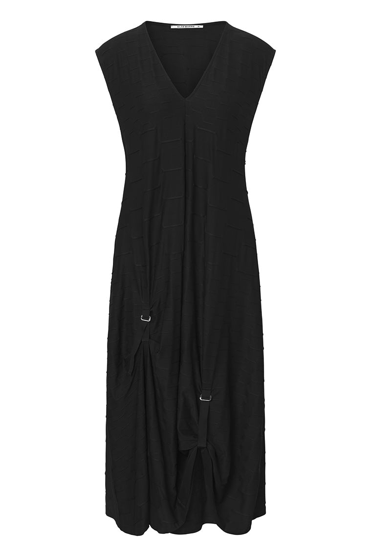 Kleid ROAMER aus der Kleidungskollektion von ELSEWHERE Fashion. Ausgestelltes Modell ärmelloses Kleid. Das Kleid hat einen V-Ausschnitt und zwei Raffdetails auf der Vorderseite. Ein fließendes und bequemes Kleid durch den vielen Dehnen.