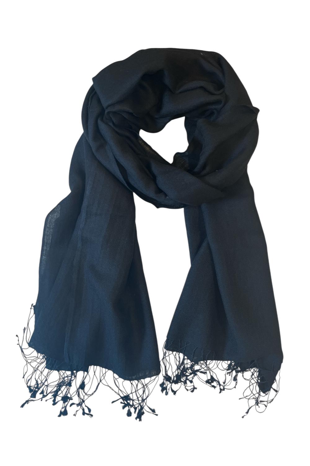 LEEZZA einfarbiger schwarzer Schal mit Fransen. Der Schal hat ein dezent eingewebtes Mini-Blockmuster.