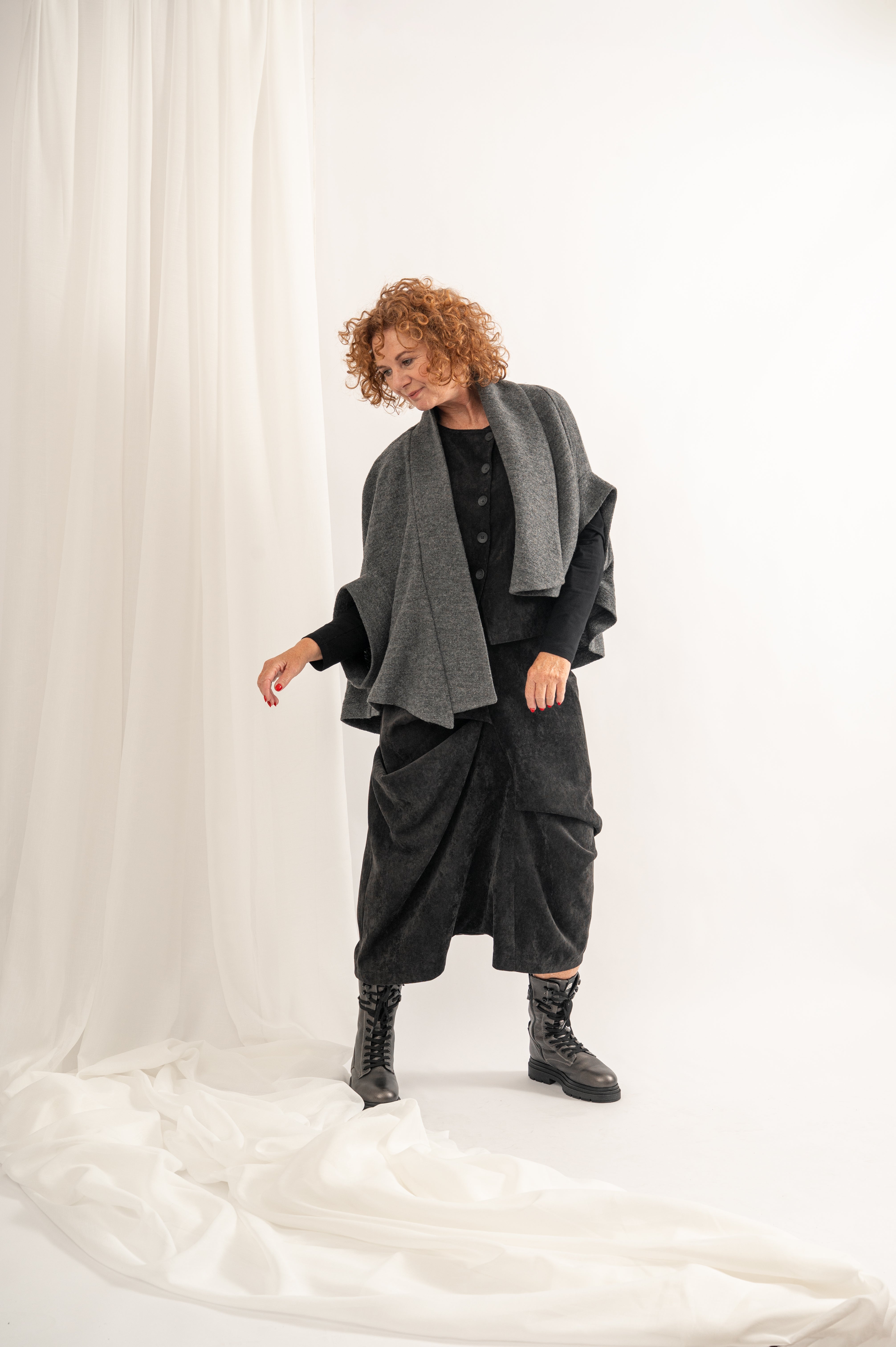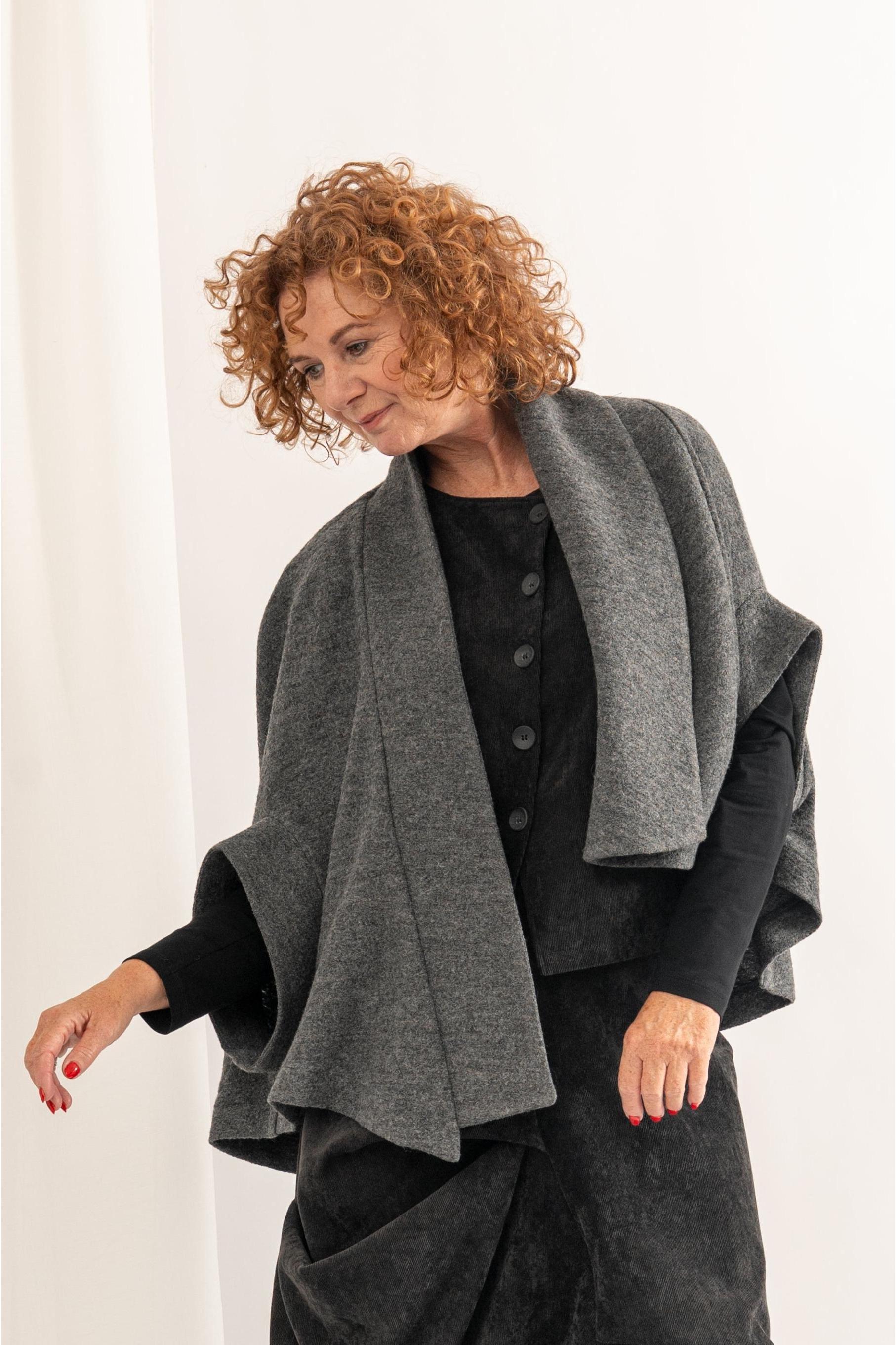 Jäckchen TORANIA aus der Bekleidungskollektion von LOTUS EATERS. Wollcape-Jäckchen mit asymmetrischer Linienführung. Das locker fallende Jäckchen hat auf einer Seite ein Revers und die Ärmel sind tief angesetzt mit breitem Bündchen.