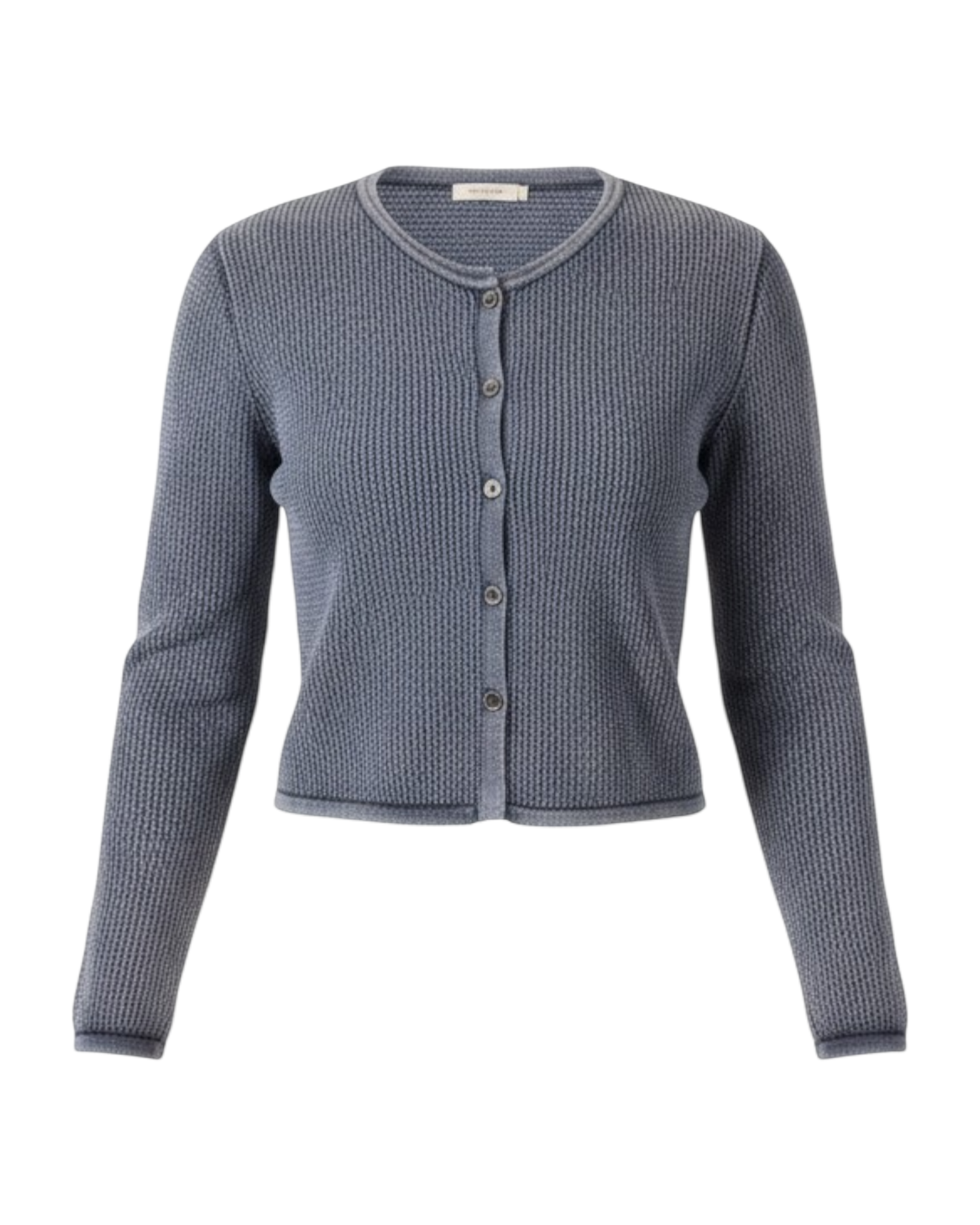 Weste CERES aus der Bekleidungskollektion von AMBER & MOON. Kurzgestrickte Weste mit dem Look einer Denim-Jacke.