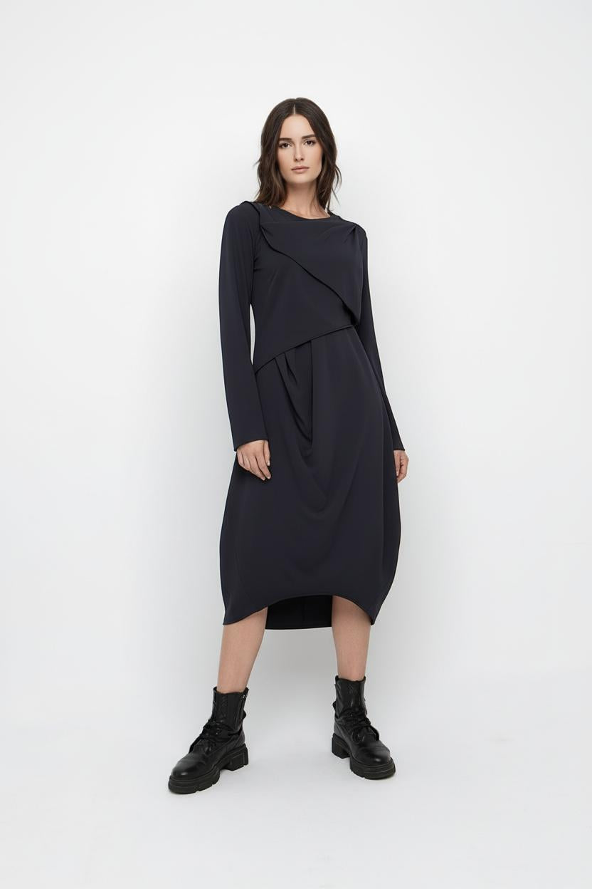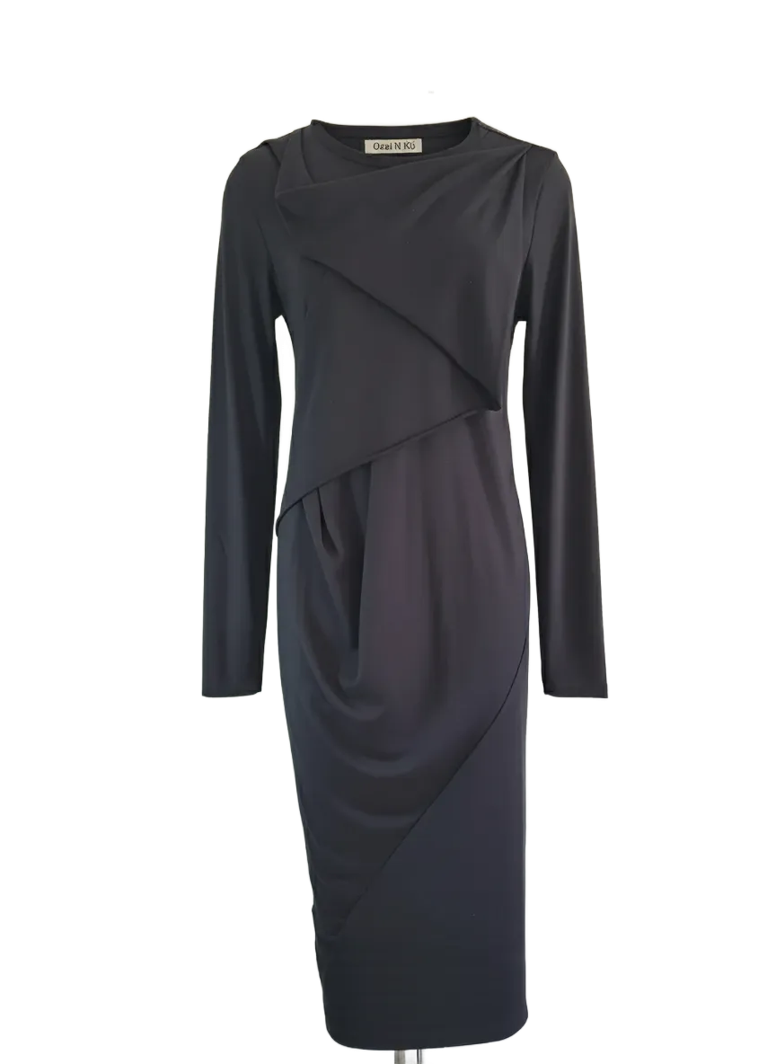 Dress ERATO from the OZAI N KÜ clothing collection. Fitted dress with an extra wrap detail on the front. The dress has long sleeves and a round neckline.