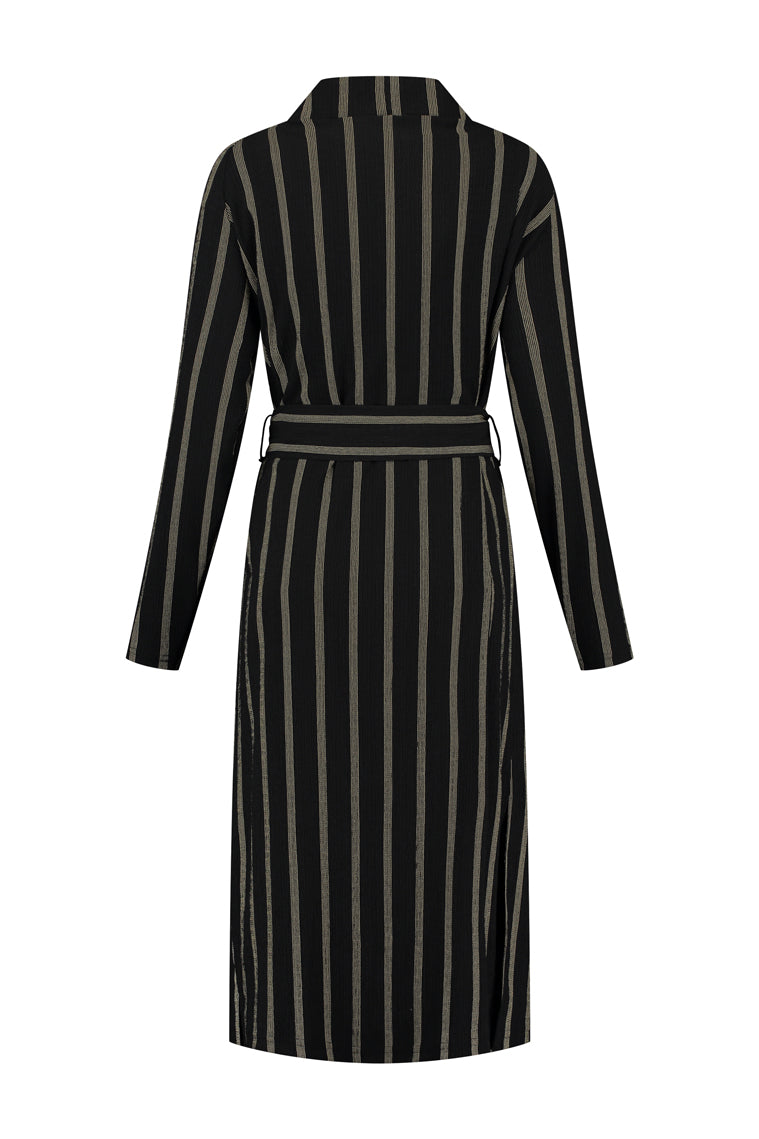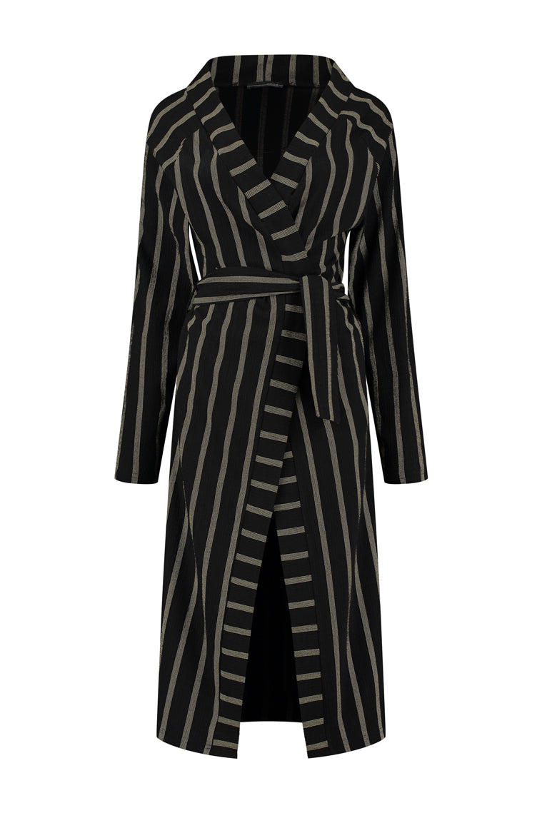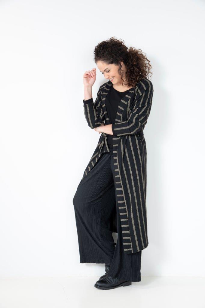 Long cardigan from ELSEWHERE Fashion. Straight kimono model with tie belt at the waist. The cardigan is trimmed with a wide trim with a stripe in the opposite direction. Made of supple black jersey with a woven seasalt color stripe.