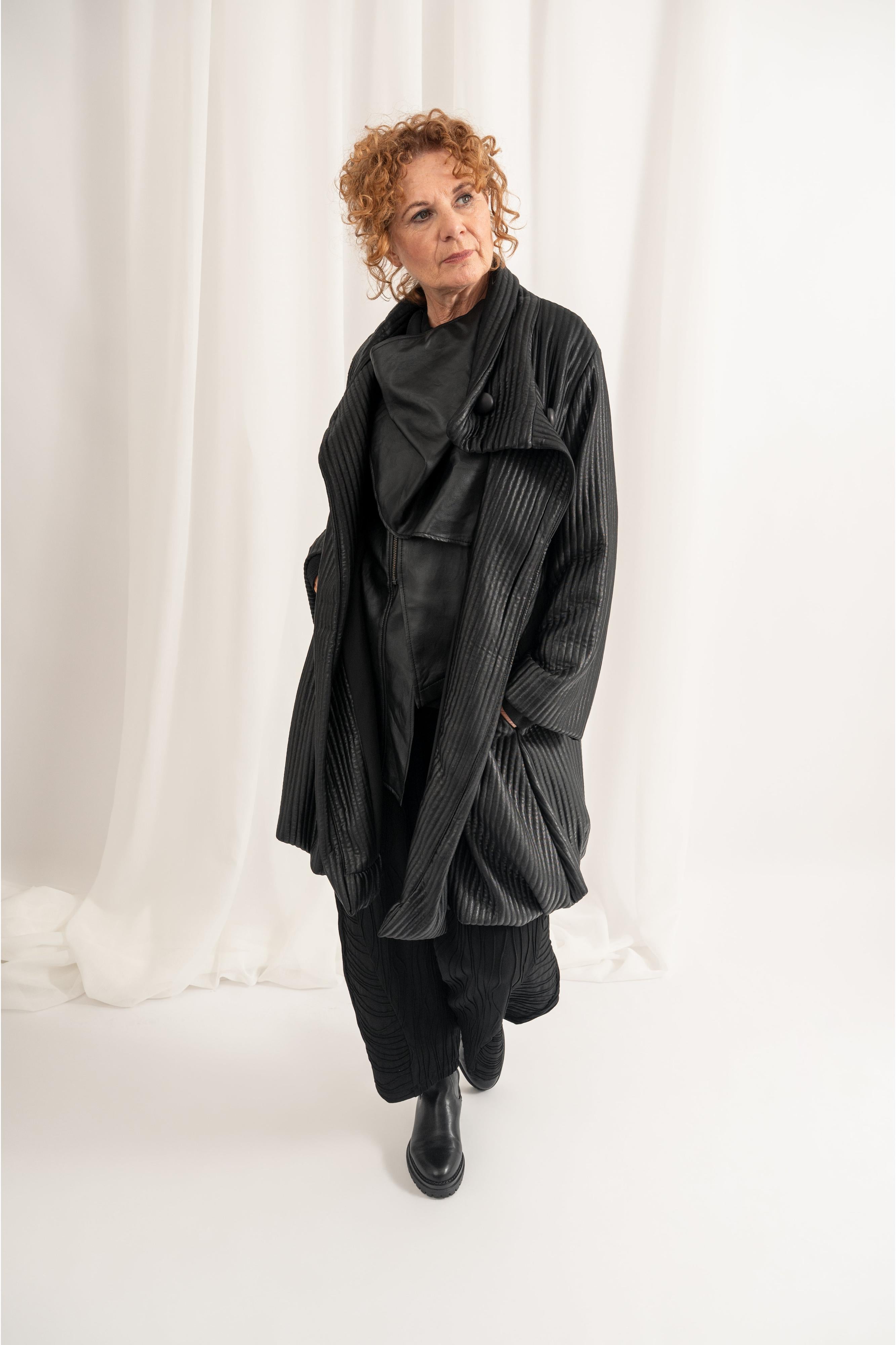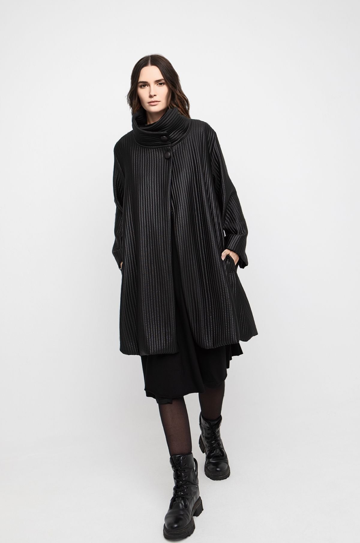 Jasj EKTI from the OZAI N KÜ clothing collection. A-line coat with a large stand-up collar. The coat fastens at the top with two large buttons.