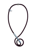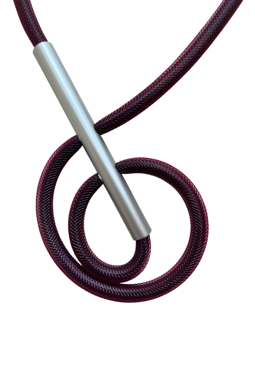 Necklace from the jewelry collection of AnZZ. The necklace features a long aluminum element and the rubber is covered with red transparent mesh. The necklace has a magnetic clasp.
