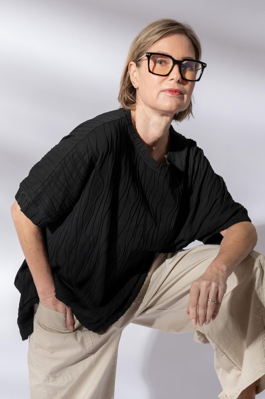 Top FLOW from the clothing collection of ELSEWHERE Fashion. Oversized top with asymmetrical lines. The top has a round neck and sleeves up to the elbow.