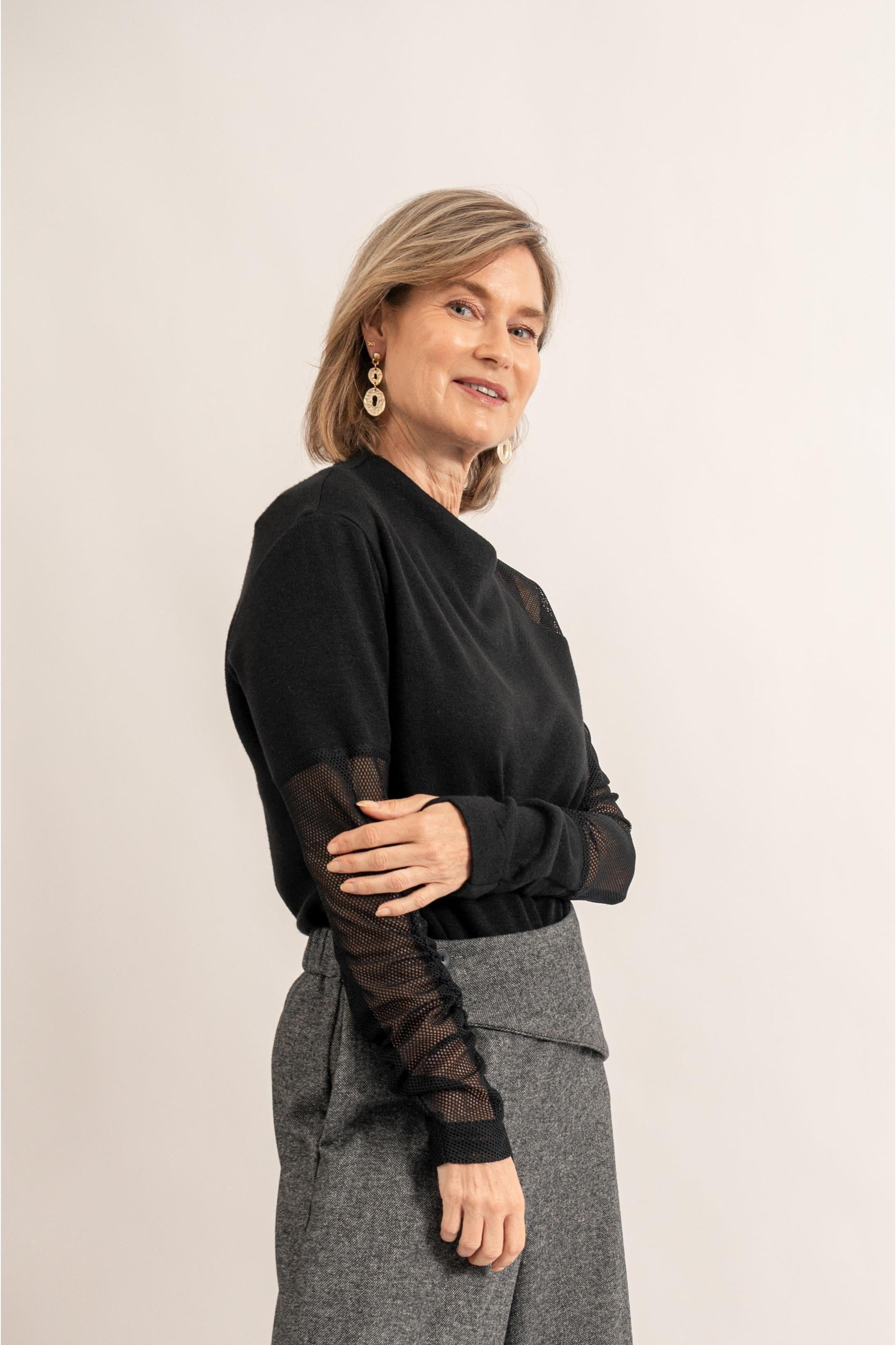 Pullover QUID uit de kleding collectie van LOTUS EATERS. Pullover met asymmterische halslijn. De pullover heeft transparante lange mouwen van mesh met duimlussen. De linkermouw heeft mesh tot in de hals en een brede boord van hetzelfde materiaal als de body. In de linke zijnaad zit een korte split.