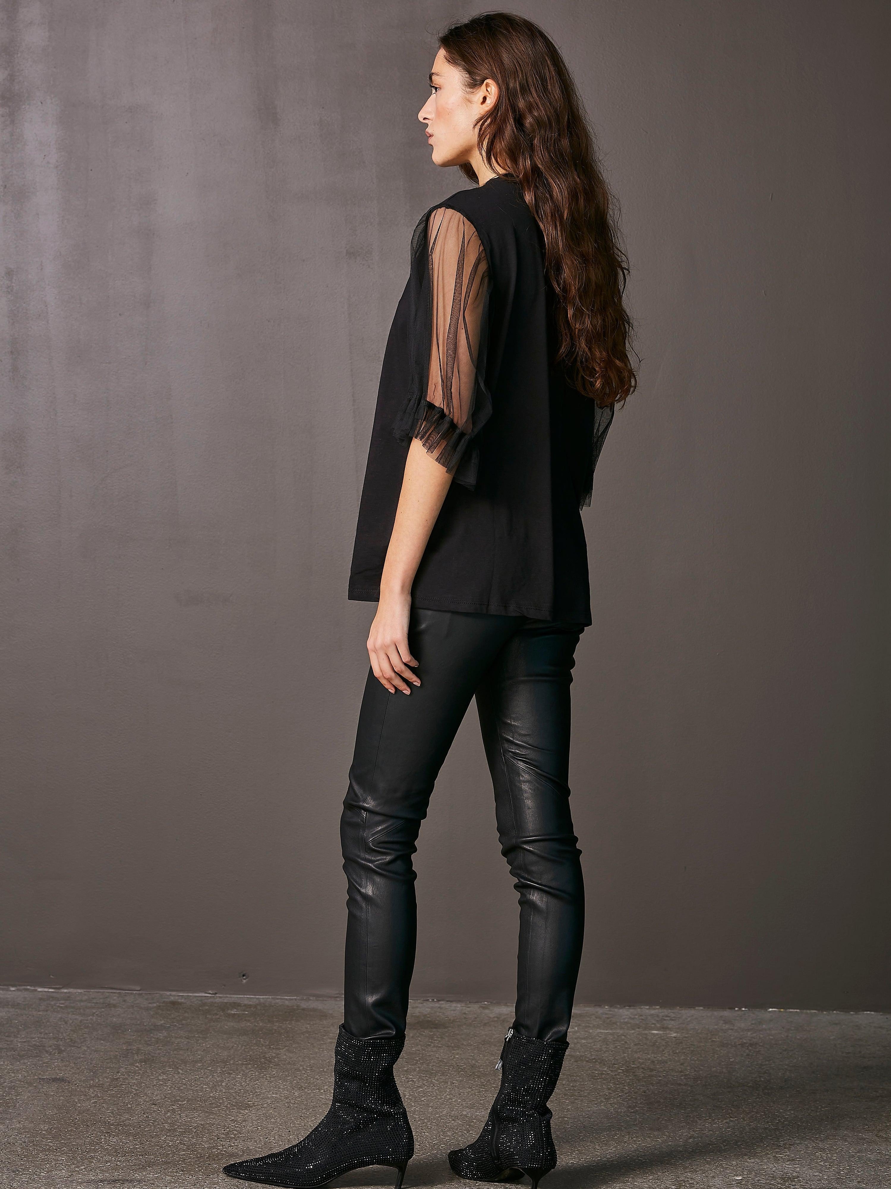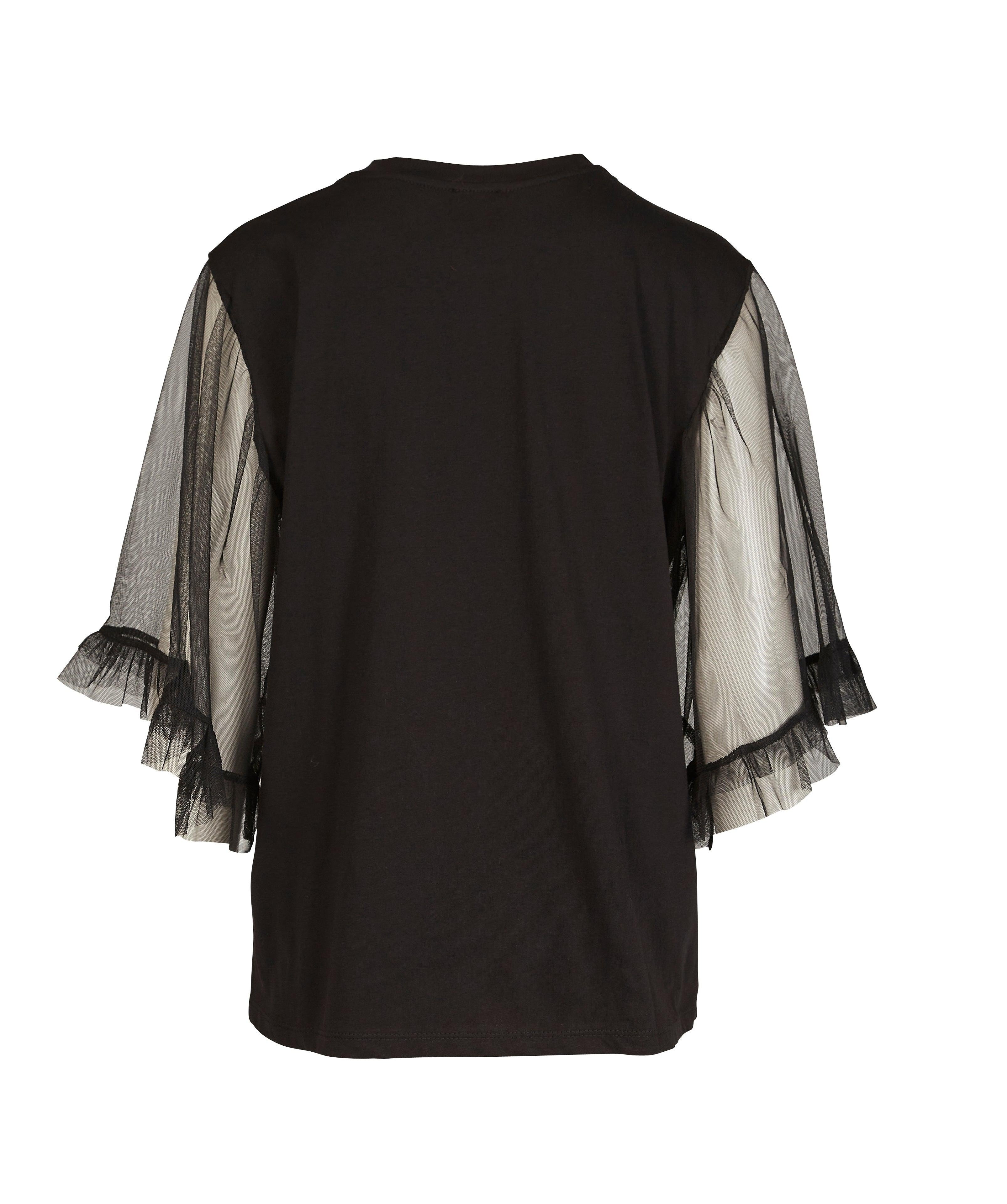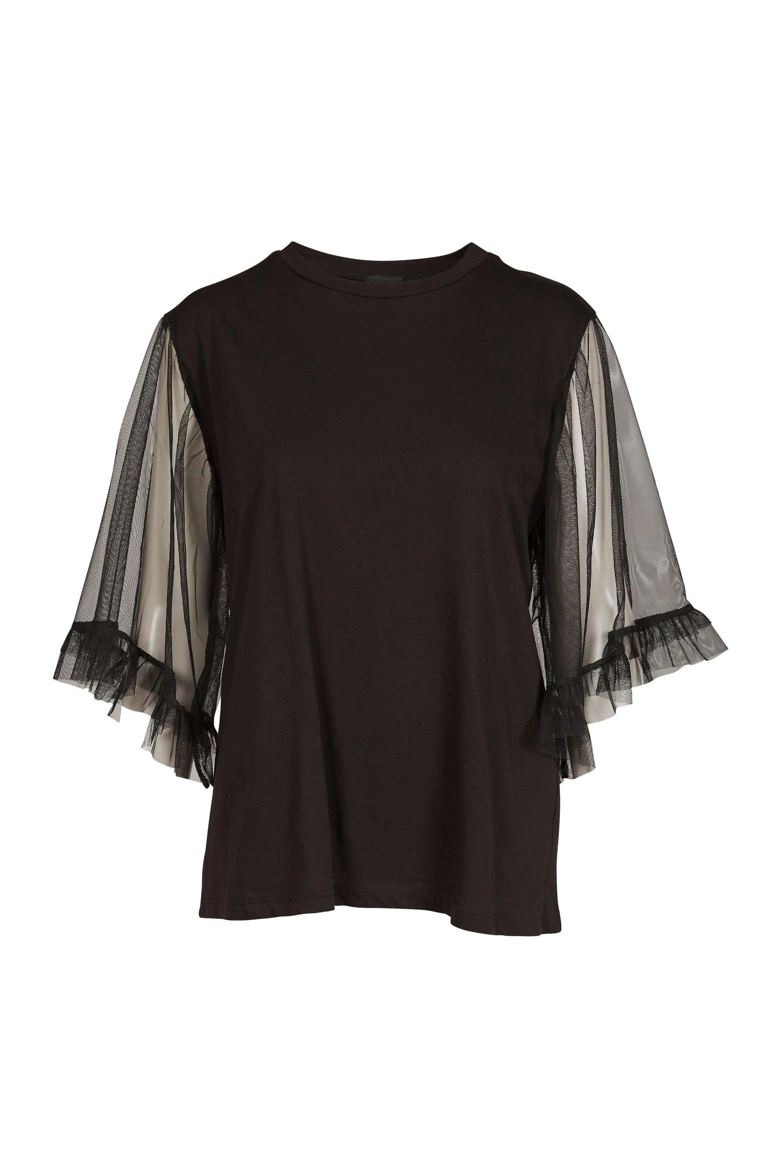 Top VIGGA uit de kleding collectie van NÜ Denmark. Rechte top met ronde hals. De mouwen zijn wat wijder en aangerimpeld en gemaakt van licht transparante mesh.