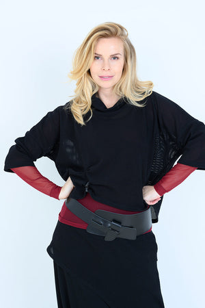 Ledergürtel ANCHORAGE aus der Bekleidungskollektion von ELSEWHERE Fashion. Weit ausgestelltes Modell, bestehend aus zwei Teilen mit schwarzem Metallglied. Der Gürtel schließt mit einem Lederriemen durch eine schwarze Metallöse.