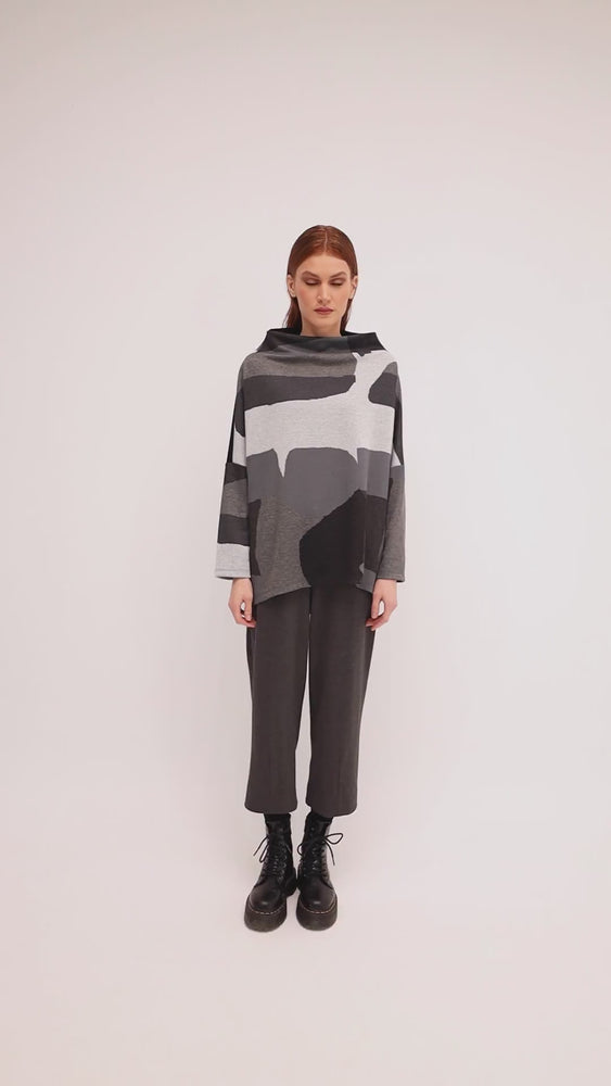 Broek GRIZO uit de kleding collectie van OZAI N KU. Comfortabele antraciet grijze broek met twee steekzakken en een tailleband met elastiek. De broek loopt naar onder iets taps toe.