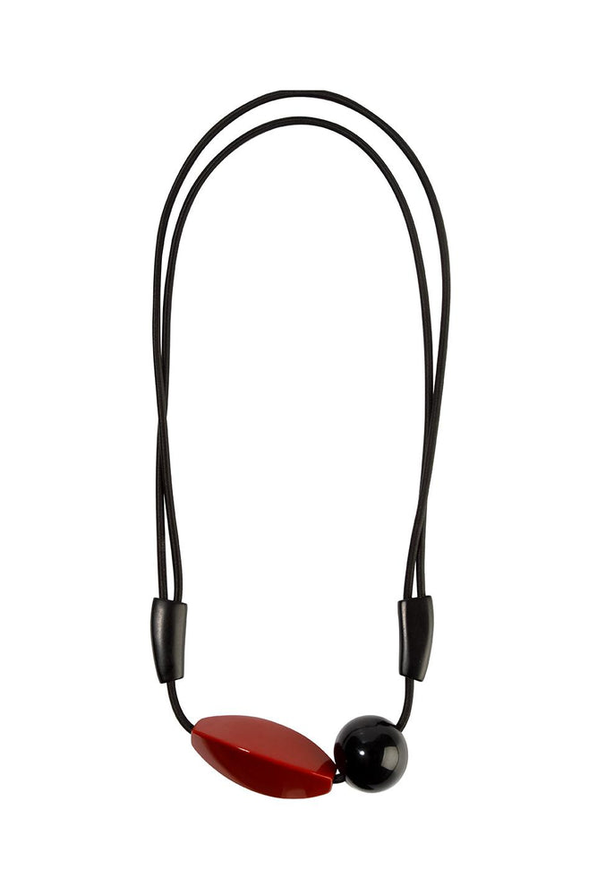 Ketting uit de Bossanova Collectie van Zsiska met twee kralen in rood en zwart. De ketting is niet verstelbaar in lengte maar is wel makkelijk draagbaar omdat de kralen aan een zwart elastisch koord zijn bevestigd. De ø van de zwart kraal is 20 mm; de lengte van de rode kraal is 4 cm. HANDMADE